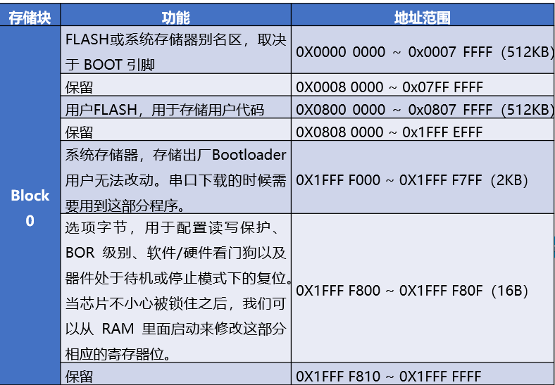从上图可以看出SRAM与FLASH最大都支持512MB,但F103ZET6实际FLASH只有512KB,SRAM有64KB(sarmf10xx都是64,flash大小 根据小/中/大容量产品不同) >这个表可以在**数据手册-存储器映像章节**找到,但不是上图的形式 ### Block 0(FLASH) 用于存储代码,该块地址映射到了一块片内的FLASH上,掉电保存代码,里面存储着官方编写的Bootloader(Bootloader程序是我们无法更改的),用于ISP下载,我们平时使用串口下载程序就是 这块内存的代码在起作用。同样我们编写的用户代码也是这一块区域 **大小**