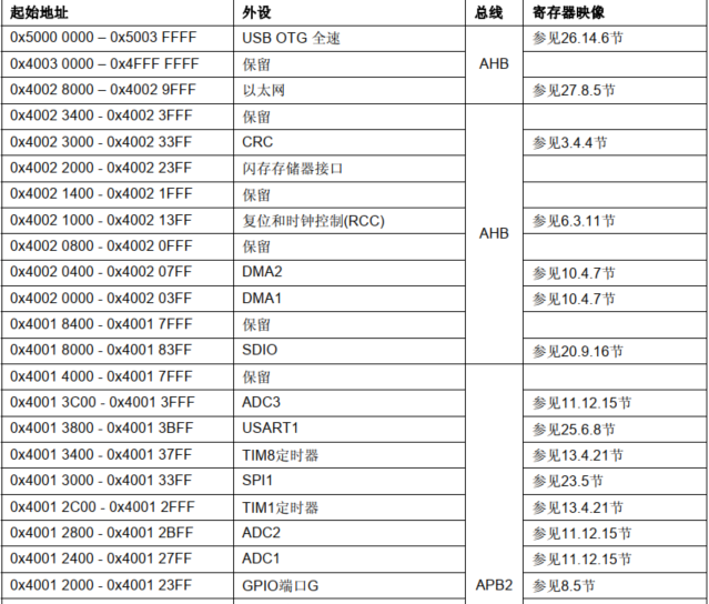 这个表可以在数据手册-存储器映像章节找到,但不是上图的形式
