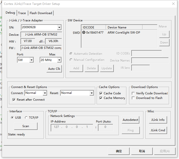 链接好硬件线路后,安装仿真器驱动Setup_JLinkARM_V468.exe,驱动安装之后,桌面出现两个软件,分别是 J-Link 控制检测程序和 J-Flash 下载程序。SEGGER 公司提供的 J-Flash 软件可以通过 J-Link 下载(烧写,烧录,编程)数据文件 HEX。(貌似安装MDK时就安装了,我并没有安装也可以使用) 点击上方菜单栏的小锤子,选择Debug界面,打开以下窗口,选择好对应调试器--J-LINK/J-TRACE Cortex