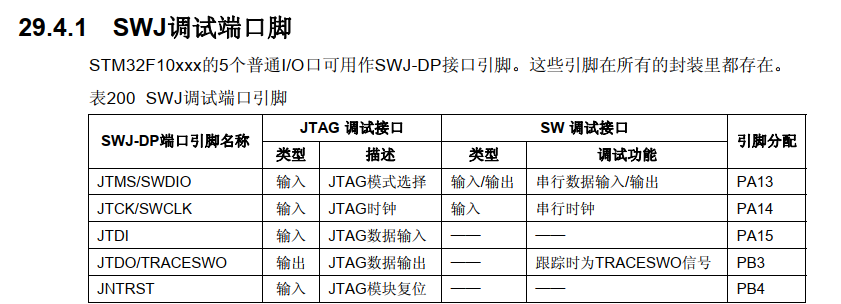 SWD调试接口: PA13、PA14共两个引脚。 JTAG调试接口: PA13、PA14、PA15、PB3、PB4共五个引脚。