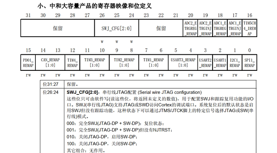 我们需要去操作复用重映射和调试I/O配置寄存器(AFIO_MAPR)的SWJ_CFG位去完成调试接口的开启与禁用,