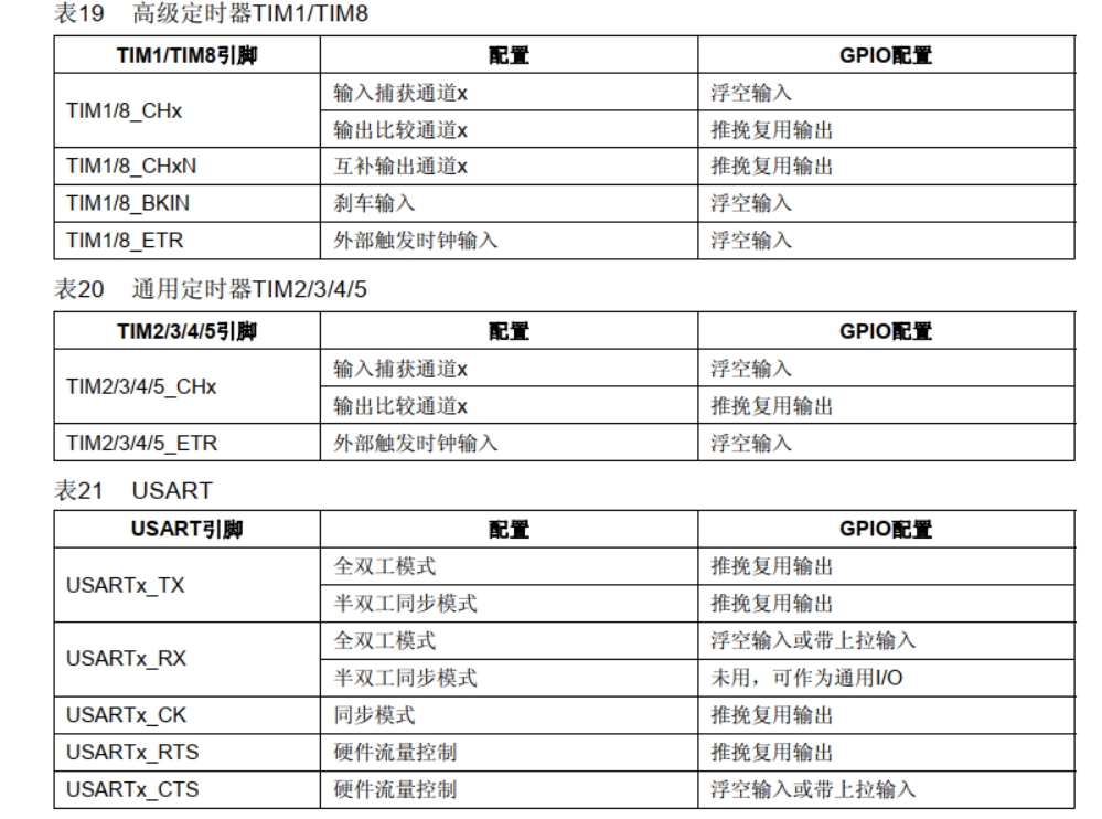 在参考手册的8.1.9章节给出了GPIO复用时的设置,下面给出部分设置截图,但是并没有给出上下拉的具体设置,应当是需要根据实际外部硬件设置的,也有可能与连接的设备有关,查考连接的设备的数据手册,可以参考正点原子例程,或参考STM32cubeIDE的固件库的Project的相关例程,如果不确定在画PCB时可以预留一下上下拉电阻的焊盘。