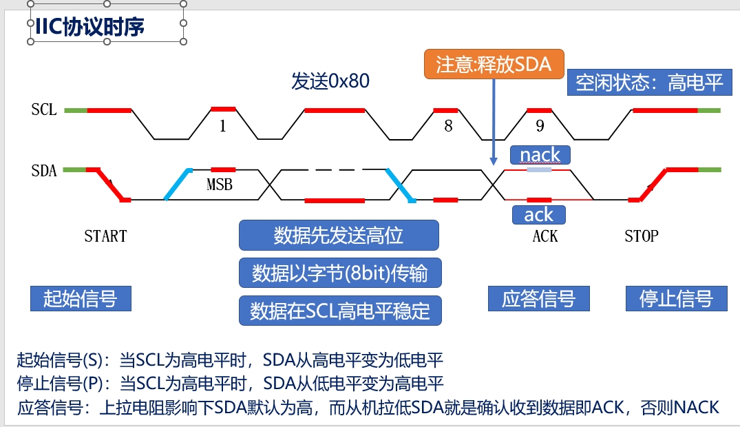 应答信号:在发送8字节数据后,时钟线SCL处于第九个高电平期间,SDA检测到高电平就是NACK(默认上拉电阻下就是高定平),SDA检测到低电平就是ACK(从机若应答,发送低电平,拉低SDA电平)