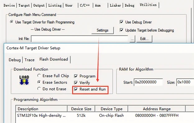 在Utilities界面下选择Seeting,勾选“Reset and Run”