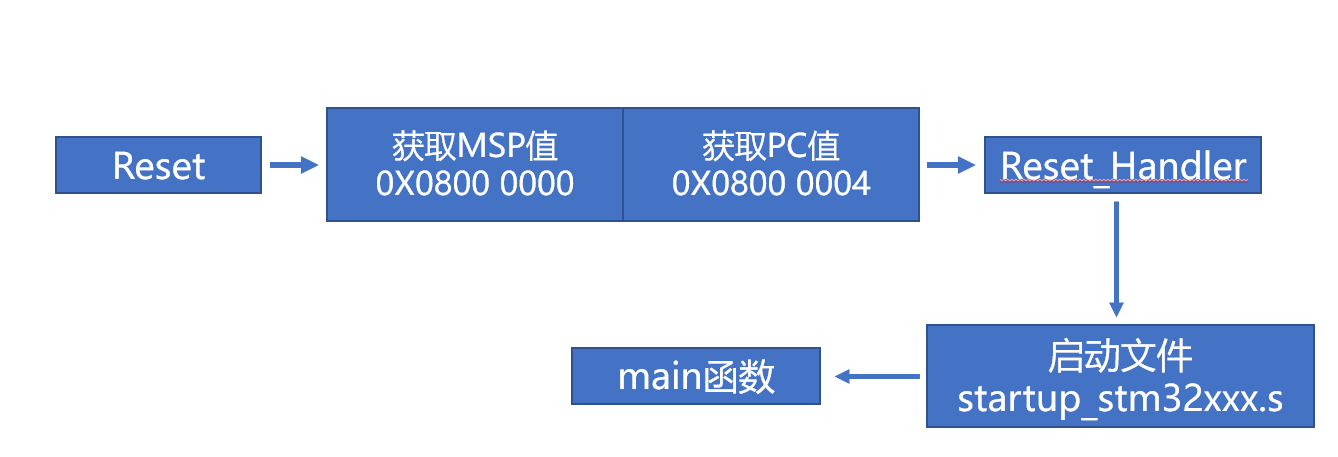 PC(Program Counter,PC)用来存放当前欲执行指令的地址,即PC指针指向哪里,程序就运行到哪里。实际上启动文件并没有直接设置PC指针的值,根据参考手册的描述,STM32启动后触发复位中断,而该中断地址上存储着Reset_Handler函数