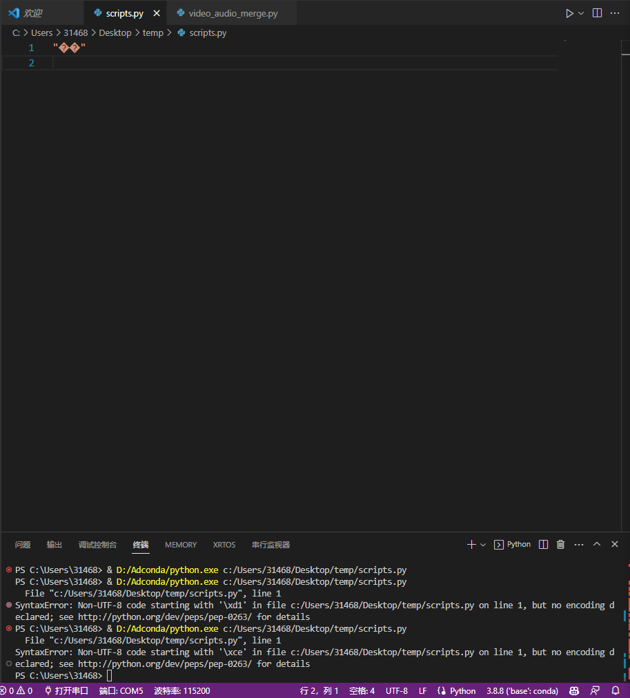 PYTHON3.8,在VSCODE中选择编码方式为GB2312(这里选择“通过编码保存”选项),代码中不声明编码格式,即使用默认的utf8编码
