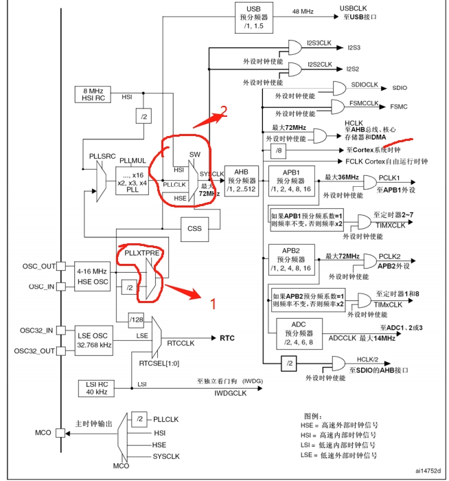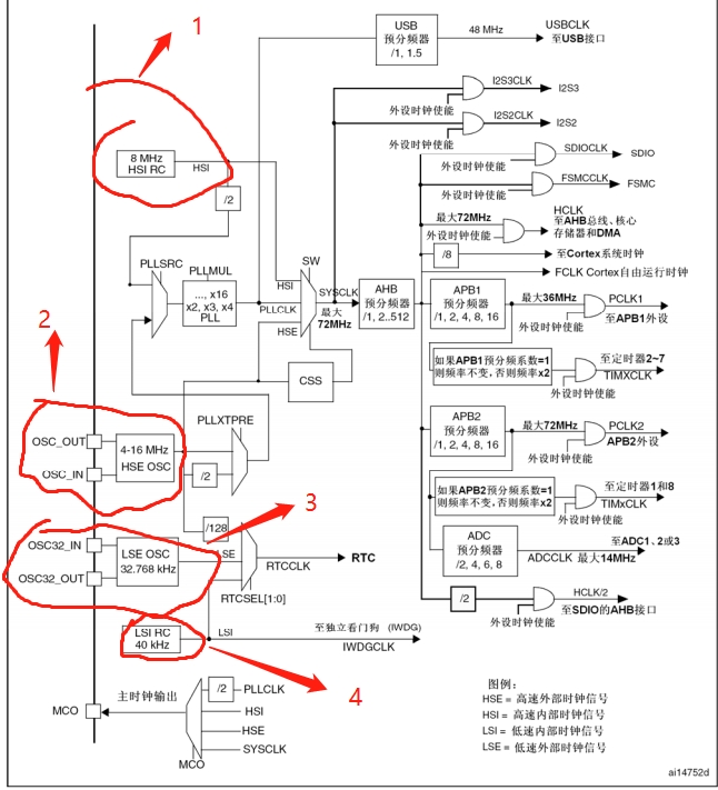 共有4个时钟来源,序号1--HSI内部高速时钟,序号2--HSE外部高速,序号3-LSE低速外部,序号4--LSI低速内部,如何区分: