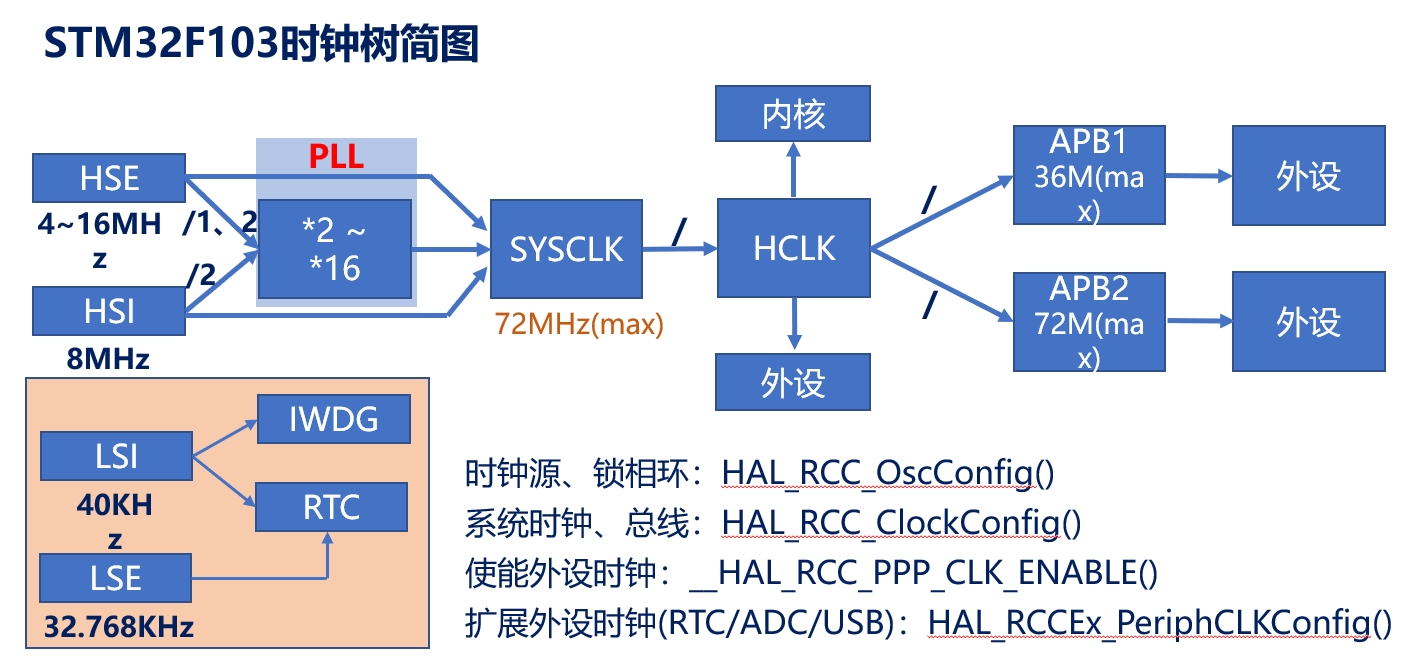 原版时钟树较复杂,可简化如下,如:SYSCLK可以选择来自HSI的原生输入,也可以来自HSE的原生输入,也可以选择来自PLL的2-16倍频。